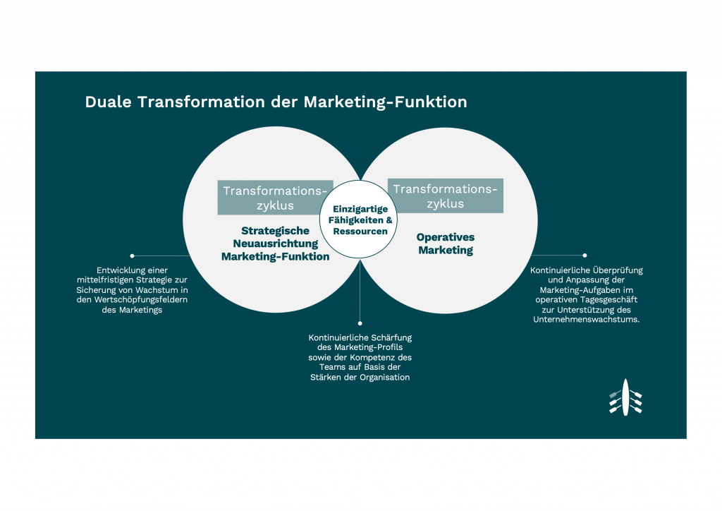 - Strategische Neuausrichtung der Marketing-Funktion (Definition von Auftrag und Mandat) sowie Performance-Orientierung (messbarer Wertbeitrag)